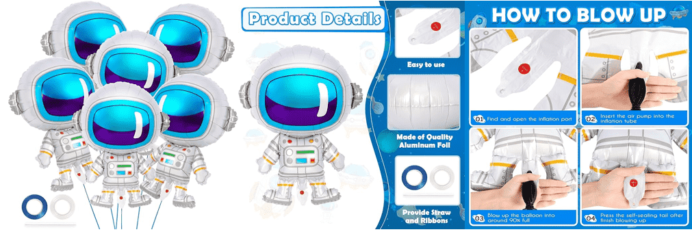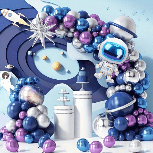 مجموعة إكليل البالونات من رقائق رائد الفضاء هي سلاح لافت للنظر للأنشطة واسعة النطاق، ومناسبة لجدار خلفية الحفلات، وتصميم مدخل أنشطة مراكز التسوق. مع سلسلة البالونات كقاعدة، يتخلل بالون طباعة رائد الفضاء وبالون رقائق الصواريخ وبالون الكوكب الملون وبالون اللاتكس غير اللامع ويتم تثبيته. يمكن تعليق بدلة الإكليل مباشرة على الحائط أو إطار الباب. يتطابق نظام ألوان السماء المرصعة بالنجوم العميقة مع بريق معدني ساطع، والذي يملأ على الفور جو الفضاء الغامر ويصبح التركيز البصري لموقع النشاط.