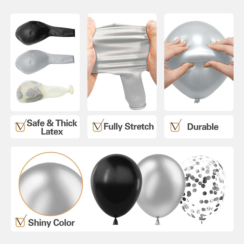 غالبًا ما تستخدم ديكورات مجموعات إكليل البالونات باللونين الأسود والفضي بالونات اللاتكس. لديهم أحجام مختلفة. الألوان هي الأسود غير اللامع والفضي المعدني. لديهم طبقات واضحة وتألق مطابق لطيف. المظهر كله كامل وثلاثي الأبعاد. لاتكس عالي الجودة يجعل البالونات قابلة للتمدد وناعمة. لا تنفجر بسهولة. حتى عند وضعها لفترة طويلة، فإنها تبقى ممتلئة ومستديرة. لن تسرب الهواء أو تفقد اللون بسهولة. تحتوي بعض المجموعات أيضًا على بالونات فويل. هذه تضيف نظرة عاكسة. إنها تجعل الزخرفة بأكملها أكثر لمعانًا ولها ملمس جميل. إنها تظهر طرازًا عصريًا فاخرًا.