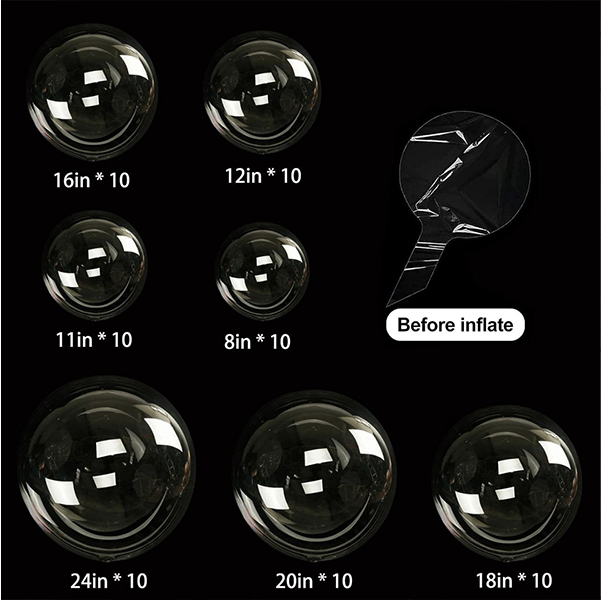 بالونات بوبو الشفافة متوفرة بأحجام مختلفة، مدرجة هنا. تتوافق الأحجام المختلفة مع النماذج المختلفة وأبعادها المتضخمة بشكل عام. يمكنك تخصيص مقاسك وفقًا لذلك.