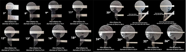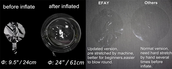 تتطلب هذه البالونات الفقاعية ذات الفم الواسع جهدًا كبيرًا للتمدد باليد. تقوم العلامة التجارية Niun بتمديد البالونات خصيصًا بواسطة الآلة قبل الشحن، مما يوفر لك الوقت والجهد عند النفخ. للحصول على نتائج أفضل وشكل بالون أكثر استدارة، نوصي باستخدام مضخة هواء كهربائية.