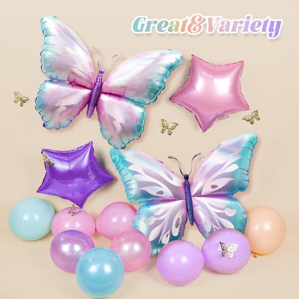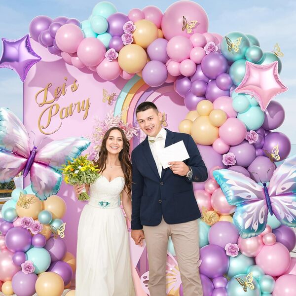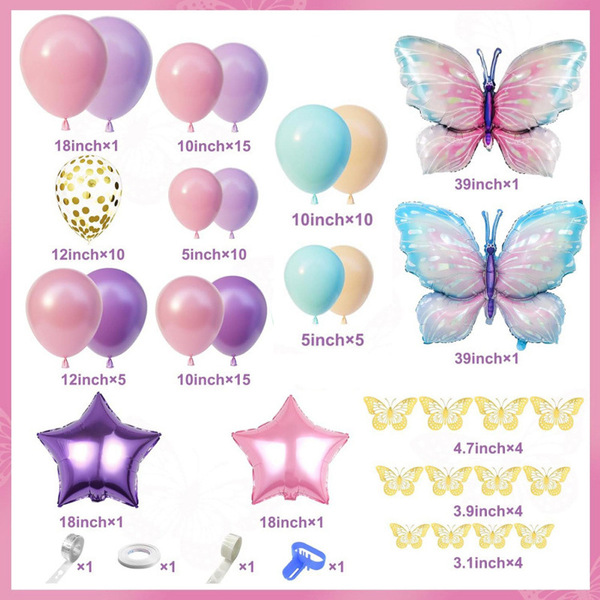 مجموعة قوس البالونات على شكل فراشة: مجموعة القوس ملونة ولافتة للنظر، وتتكون من بالونات رقائق معدنية مختلفة وبالونات اللاتكس. عند ترتيبها، قم بإضافة لوحة خلفية بها أنماط ونصوص مختلفة، ثم قم بإحاطة البالونات حولها. فهو خالق الجو في الحدث. التقاط الصور أمامه سيبدو جميلًا جدًا.