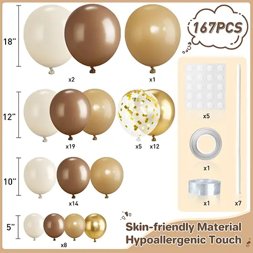 · المكونات المتضمنة: بالونات قياسية متناسبة مسبقًا بلون الجمل (تحتوي على 5 ظلال متدرجة)، وقاعدة مقوسة عالية القوة، وموصلات احترافية، وقفازات منقطة بالصمغ، ودليل تثبيت مبسط.