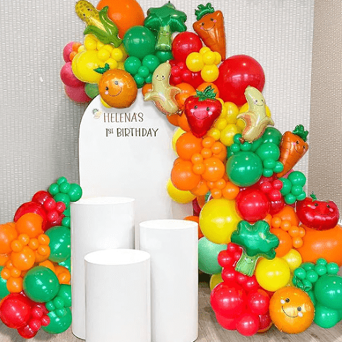 مجموعات أكاليل بالونات الفواكه والخضروات: استخدم بالونات اللاتكس بنفس الطريقة لإضافة طبقات وثراء إلى بدلة البالون الخاصة بك. مثل بالون اللاتكس الوردي والأخضر مع الفراولة، وبالون رقائق البطيخ، لخلق شعور جديد وحلو. استخدم بالونات حروف عيد ميلاد سعيد وبالونات أرقام لإنشاء ديكور كامل لحفلة عيد ميلاد، مثالي لمشاهد الحفلات المختلفة.