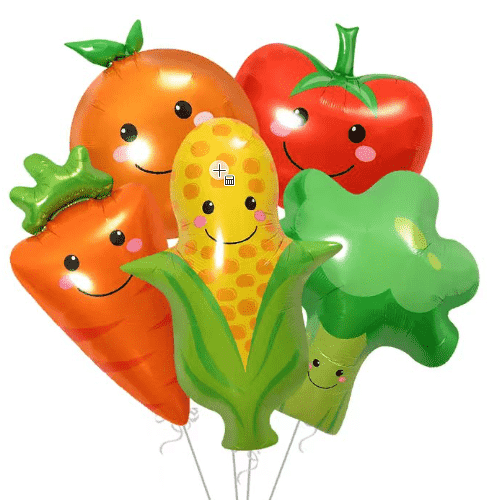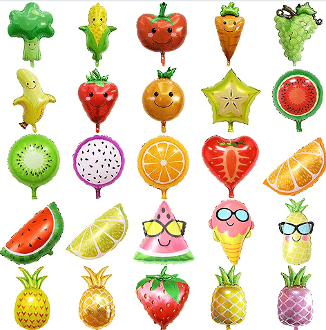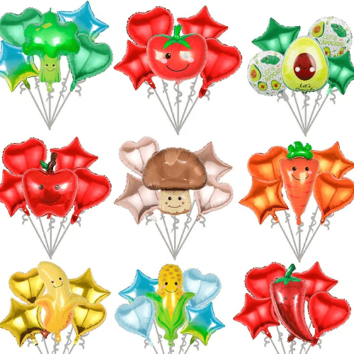مجموعة بالونات رقائق معدنية: استخدم مجموعة متنوعة من بالونات رقائق الخضروات والفواكه المختلفة لتجمع معًا لتكوين طبق فاكهة أو تأثير على شكل حديقة الخضروات. على سبيل المثال، البطيخ والفراولة والبرتقال والموز وغيرها من البالونات، لخلق جو موضوع الفاكهة مفعم بالحيوية.