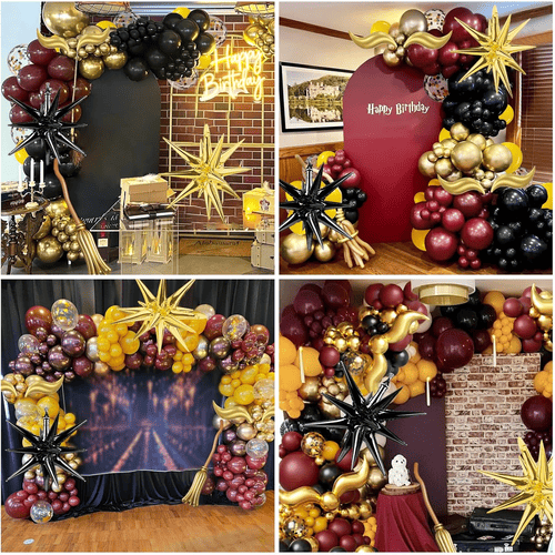 بالون اللاتكس الموجود في قوس البالون الذي يحمل طابع هاري بوتر مصنوع من اللاتكس الخام بنسبة 100% والذي يتم استيراده من جنوب شرق آسيا. نظرًا لأنها مواد طبيعية، فهي صديقة للبيئة تمامًا وغير ضارة للأطفال والكبار. ألوانها هي ألوان رمزية لأفلام هاري بوتر، بما في ذلك الأحمر النبيذي والأصفر والأسود والذهبي. لإضافة المزيد من الطبقات، أضفنا أيضًا بالون القصاصات، والقصاصات ذهبية معدنية.