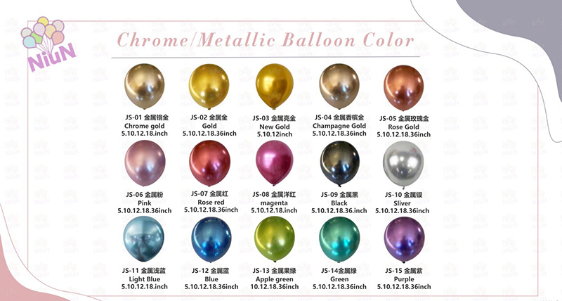 نحن نستخدم تكنولوجيا طلاء الحبر المستوردة لبالوناتنا المعدنية. الألوان متساوية وغنية. خذ تلك الموجودة في الصور كأمثلة. وهي تشمل الذهب الشمبانيا المعدني والأزرق المعدني والأرجواني المعدني. أثبتت هذه الألوان شعبيتها في الأسواق الأوروبية والأمريكية. أنها تناسب العديد من المناسبات. هذه المناسبات هي حفلات الزفاف وأعياد الميلاد واحتفالات الذكرى السنوية.