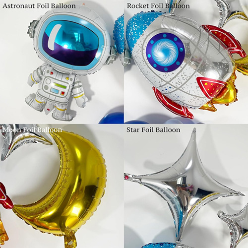 تحتوي بالونات الرقائق المعدنية على رواد فضاء وصواريخ وصحون طائرة وأشكال أخرى، مما يضيف الكثير من الاهتمام والواقع إلى هذا الطوق.