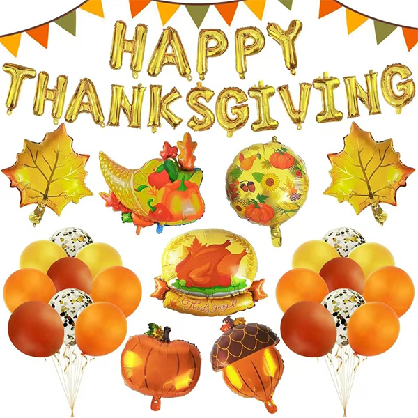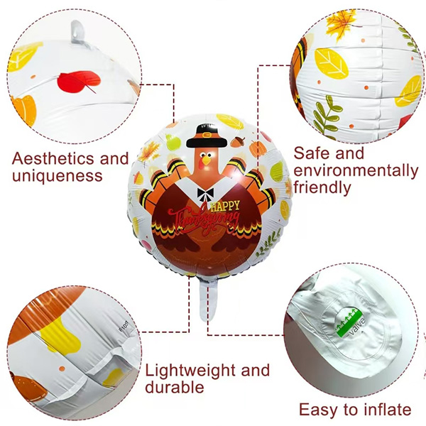 تعتبر البالونات التي تشير الشكر جزءًا مهمًا من زخرفة العطلات. لديهم العديد من عناصر الخريف والألوان المعدنية الساطعة. يجلبون الفرح والدفء إلى جو عيد الشكر. البالونات رقائق الشكر مصنوعة من مواد رقائق عالية الجودة. الملمس قوي وليس من السهل التسرب. يمكنهم البقاء ممتلئين لفترة طويلة. يمكن ملءها بالهيليوم أو الهواء. يمكنهم دائمًا أن تبدو ثلاثية الأبعاد وكاملة. فهي مناسبة جدا لكل من الديكور الداخلي والخارجي.