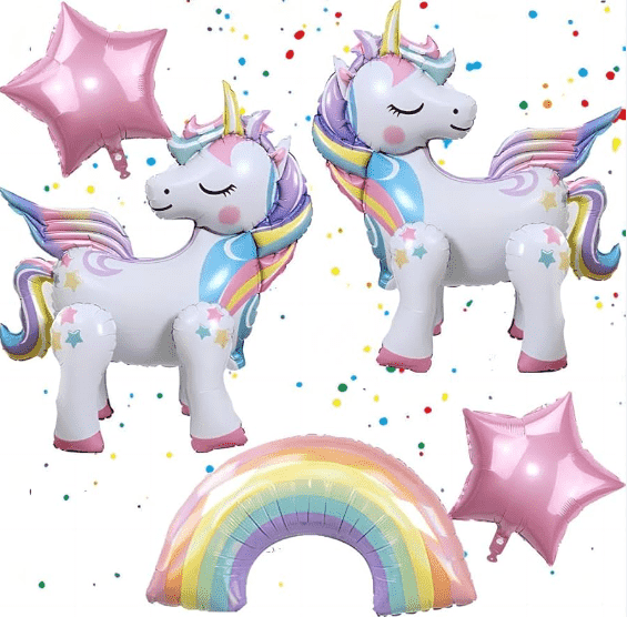 بالونات على شكل وحيد القرنتعتمد على النغمة الأساسية للحكايات الخيالية الخيالية. وهي مقسمة إلى فئتين أساسيتين: بالونات اللاتكس المطبوعة يونيكورن وبالونات رقائق يونيكورن. وتشمل أيضًا النمذجة ثلاثية الأبعاد ونماذج الفوانيس ومشتقاتها الأخرى. إنها عناصر شائعة لتزيين الحفلات.