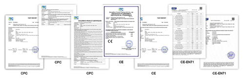 لقد اجتازت مجموعتنا الكاملة من المنتجات شهادات CPC وCE وEN71 وغيرها من الشهادات الرسمية، وذلك في امتثال صارم للوائح السلامة الأوروبية والأمريكية وغيرها من لوائح سلامة السوق المستهدفة. يمكن أن تساعد هذه المؤهلات بضائعك على التخليص الجمركي بسلاسة وتجنب مخاطر الامتثال تمامًا في الأسواق الخارجية.